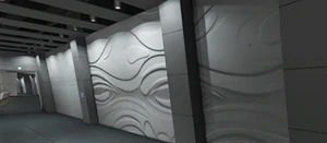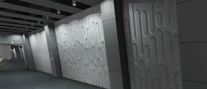 One time surreptitious, players appear in a large oval room containing the garage storage areas. The level (designated -3) contains storage for large weaponized vehicles including the Avenger. The Weaponized Vehicle Workshop with the Weapon Mechanic is found at i end. A small keypad terminal with a yellow corona is used to return to the surface on foot. Ramps and stairs lead upwardly to the mezzanine level that runs around the exterior border of the oval room. A bluish corona in the workshop provides the vehicle management menu to rearrange the stored vehicles. A walkway is visible on a third level but it is inaccessible.