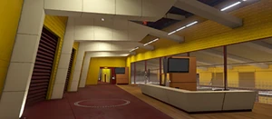 Walkways are accessible behind the reception desk and overlook the office areas below. Three stairways lead down to the lower level. The fire doors on the opposite side of the stairways are inaccessible to the role player.